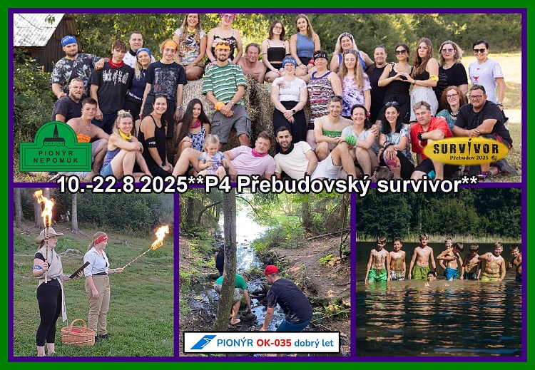 Letošní tábor P4 v termínu 10. - 22.8. 2025 jsme započali na pustém ostrově v Přebudově. Účastníci Survivoru se ocitli v prostředí, kde museli spoléhat na vlastní dovednosti, týmovou spolupráci a odvahu čelit každodenním výzvám.Celý článek po rozkliknutí nadpisu.**MarkétaK
